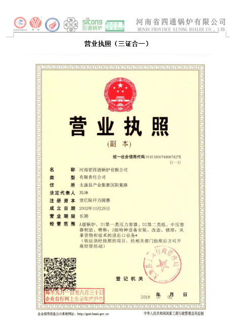 【河南四通锅炉集团】河南省四通锅炉有限公司是国家质检总局定点生产A级锅炉,D1、D2级压力容器的现代化大型企业,现生产蒸汽锅炉、燃气蒸汽锅炉、燃气热水锅炉、燃油蒸汽锅炉、燃油热水锅炉、卧式燃气蒸汽锅炉、卧式燃气热水锅炉、卧式燃油锅炉、卧式燃气锅炉、电加热蒸汽锅炉、电加热热水锅炉、有机热载体加热炉,高中温热风炉,一、二类压力容器及非标产品等28个系列,260多种规格型号,产品质量性能优越,居国内领先水平,多次荣获国家、部、省,优质、节能、产品大奖。产品远销俄罗斯、蒙古、韩国、越南、缅甸等亚州及东南亚国家和地区。
